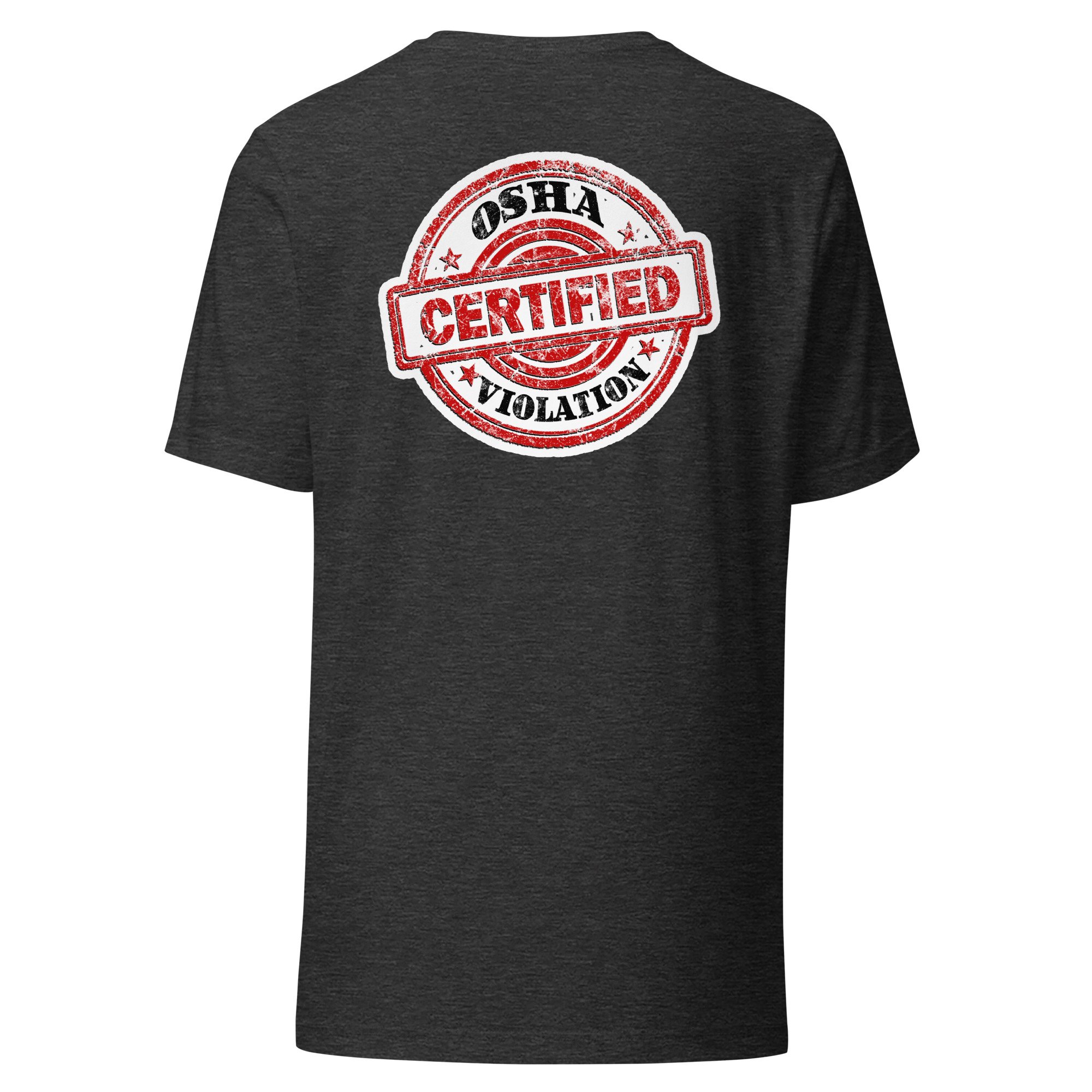 High quality tee with podcast logo on front, and Certified OSHA Violation graphic on back.