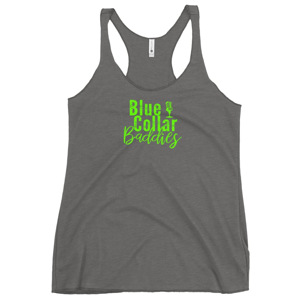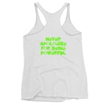 Soft, flowy material, racerback. Logo on front, Never Apologize graphic on the back